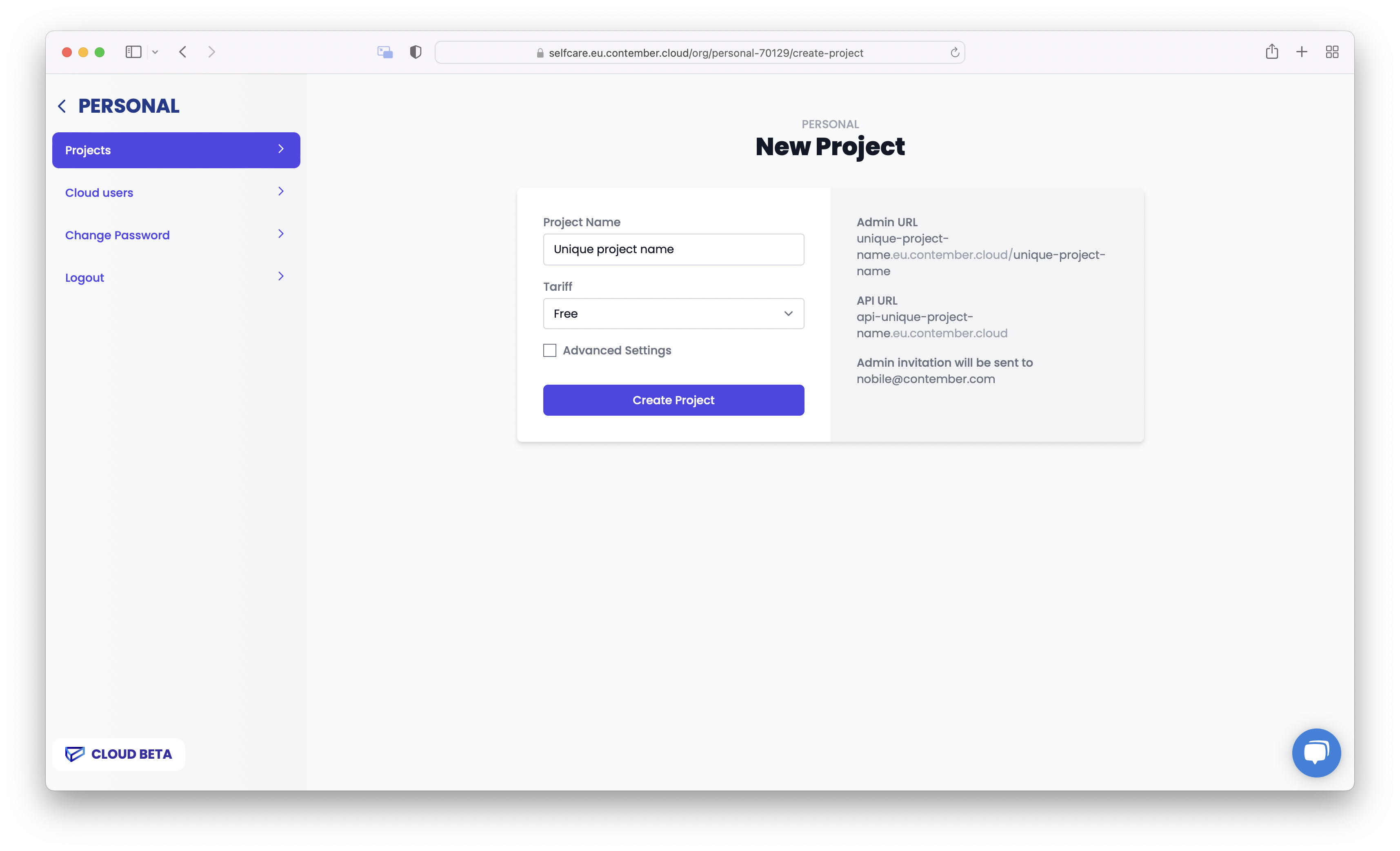Go to https://contember.cloud and create an account if you don't have one. After sign up create your first project. Choose a unique name for it.